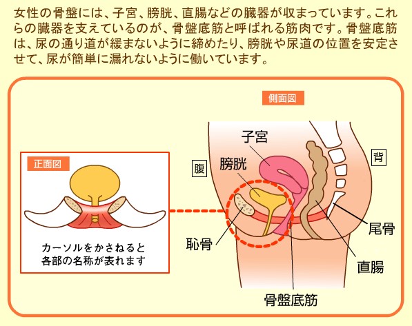 骨盤底筋体操とは、肛門と膣を締め、尿道を締める骨盤底筋群を鍛えると共に、血流をよくすることで尿漏れを予防、改善する体操です。